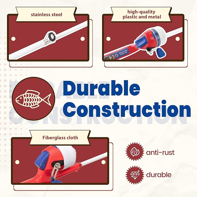 - Durable Construction: Our fishing rod's guide eyes use stainless steel instead of iron to make them less rusty. The fishing spin-cast reel with high-quality plastic and metal, which is more durable. The four-layer fiberglass cloth makes the fishing rod have better toughness and is not easy to break and rust, and it is also beneficial to the safety of children