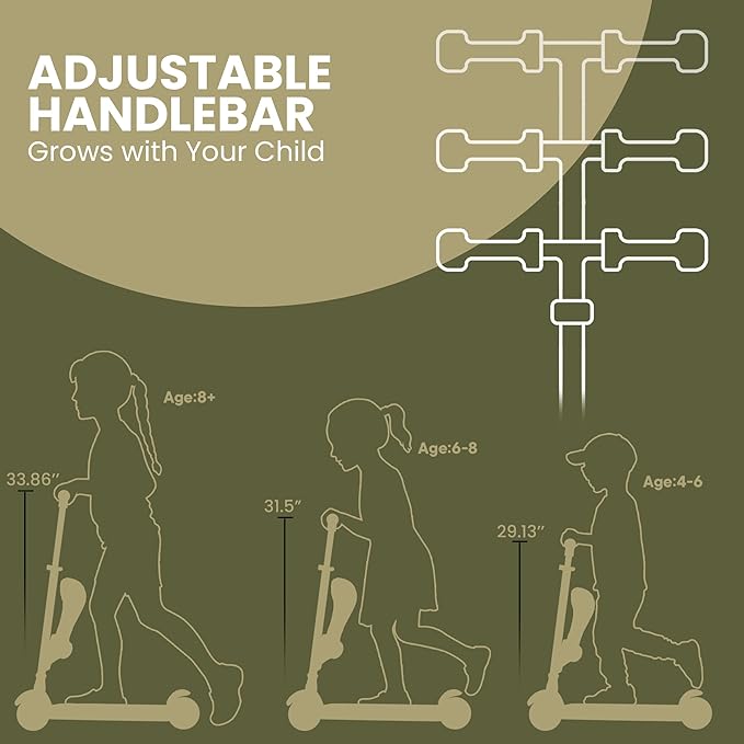 - Grows with Your Child – The adjustable T-bar handlebar offers four height settings (26.77’’, 29.13’’, 31.5’’, and 33.86’’ inches), making this kids 3 wheel scooter the perfect ride for toddlers as young as 2 years old weighing up to 165 lbs.