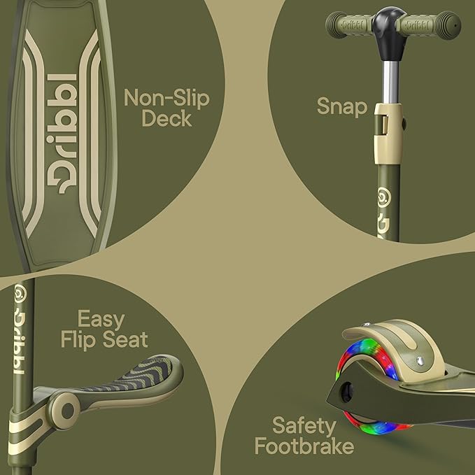 Army 3 Wheel Scooter with Seat for Kids – Light-Up LED Wheels, Adjustable Handlebar and Seat, Smooth PU Wheels, Wide Anti-Slip Deck, Rear Foot Brake – Toddler Outdoor Toys for Ages 2+