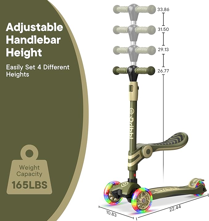 - Adjustable Seat Height – This scooter features a removable seat with 2 height options that has a weight capacity of 55 lbs, allowing kids to also sit & scoot. Perfect for growing kids, it provides comfort & confidence as they develop their riding skills!