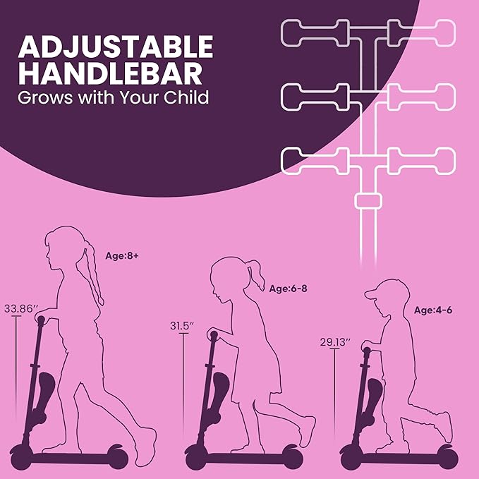 - Grows with Your Child – The adjustable T-bar handlebar offers four height settings (26.77’’, 29.13’’, 31.5’’, and 33.86’’ inches), making this kids 3 wheel scooter the perfect ride for toddlers as young as 2 years old weighing up to 165 lbs.