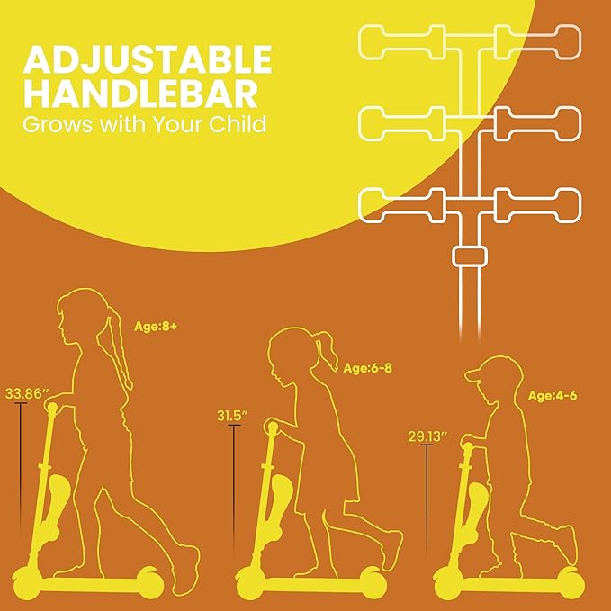 - Grows with Your Child – The adjustable T-bar handlebar offers four height settings (26.77’’, 29.13’’, 31.5’’, and 33.86’’ inches), making this kids 3 wheel scooter the perfect ride for toddlers as young as 2 years old weighing up to 165 lbs.