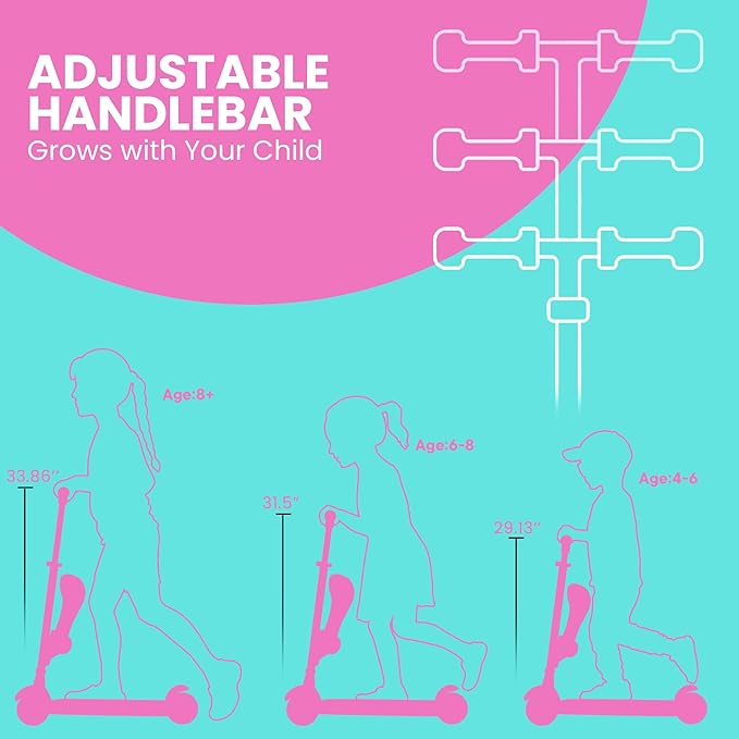 - Grows with Your Child – The adjustable T-bar handlebar offers four height settings (26.77’’, 29.13’’, 31.5’’, and 33.86’’ inches), making this kids 3 wheel scooter the perfect ride for toddlers as young as 2 years old weighing up to 165 lbs.