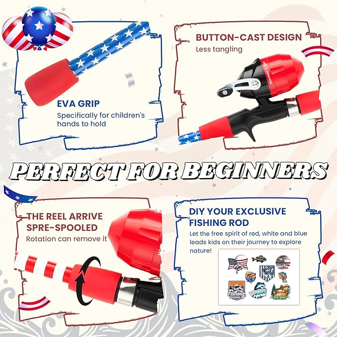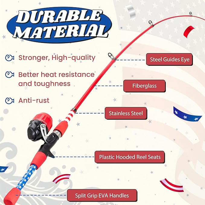 - BEST VALUE PATRIOTIC KIDS FISHING GEAR: Reel in freedom's spirit with every cast. Crafted with bold patriotic colors and iconic star-and-stripes detailing, our kids fishing pole is a mini tribute to American spirit. This Independence Day, don't just watch fireworks and parades. Take your children into nature and experience the joy of fishing!