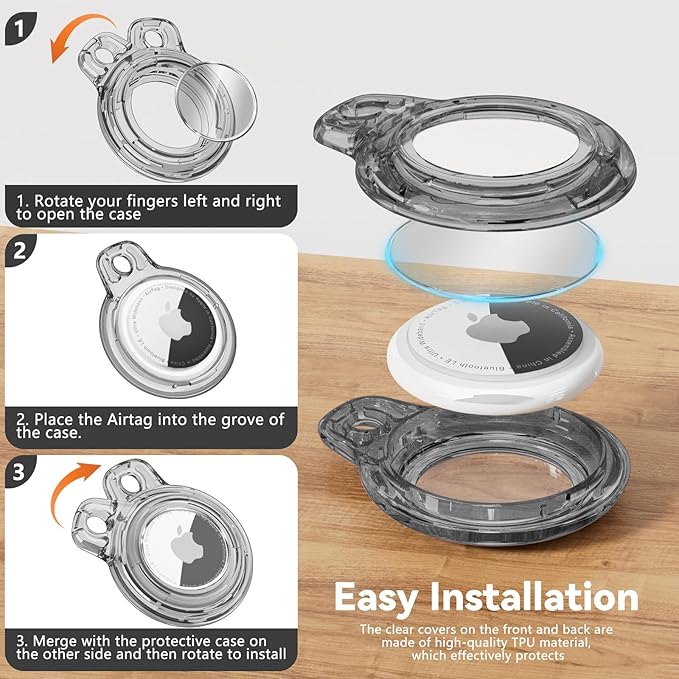 - Easy Installation: No complicated operation is required, and you can fix AirTags in the Holder in a few easy steps;[Tips]: The specific installation steps can be seen in the picture; The protective cover of the Apple Airtags keychain will not affect the touch screen and shield the signal; Whether it is finding lost items or remote tracking, it can be easily achieved