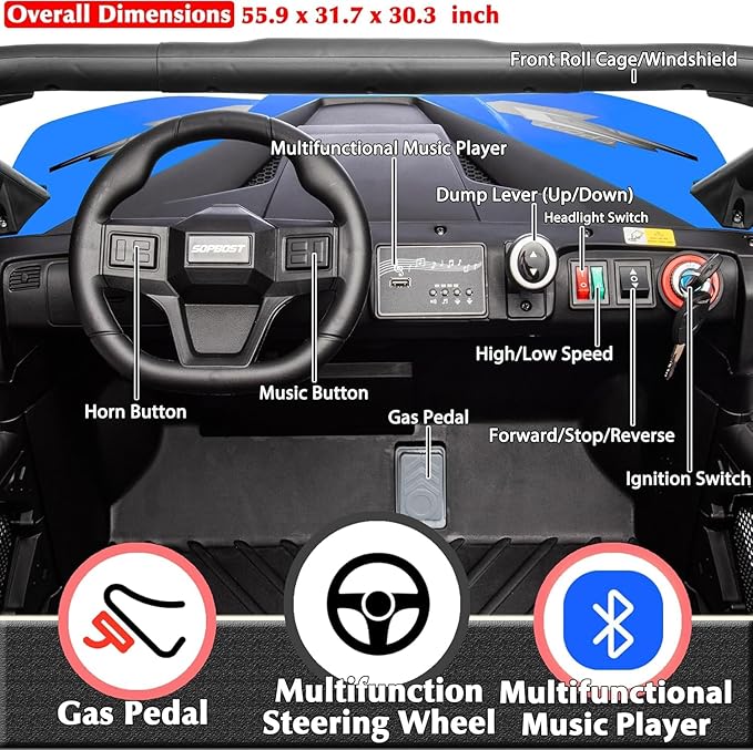 - Kids’ UTV with 1.4 Cu.Ft Dump Bed: The dump bed of this kids’ UTV is electric, kids can lift and down the dump bed by operating the joystick and handle, and it comes with a plastic shovel, your little kids can enjoy a transport experience with this side-by-side UTV. And the multifunctional music panel provides built-in music and devices connection functions (AUX/USB interface and wireless connection), enhances entertainments of this kids' toy car.