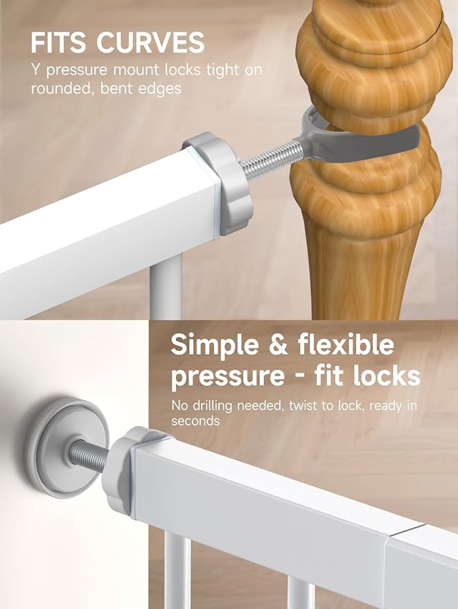 - Double Safety with a Double-Lock Design: The child gate is equipped with double lock design. This double lock mode makes it difficult for toddlers to open the gate, Sturdy safety gate to keep your baby out of the top of the stairs, laundry room or kitchen, and keep your dogs out of the main living area. Perfect for children aged 6-36 months and great for dogs as well