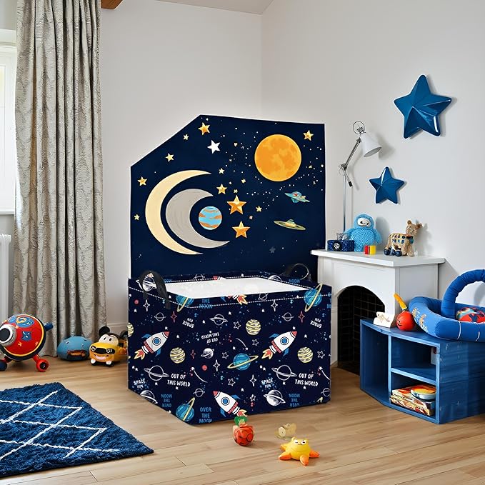 HIYAGON Rectangular Space Basket for Boys Baby Storage Basket Storage Bin Organizer Box Room Decor(Rocket Planet)