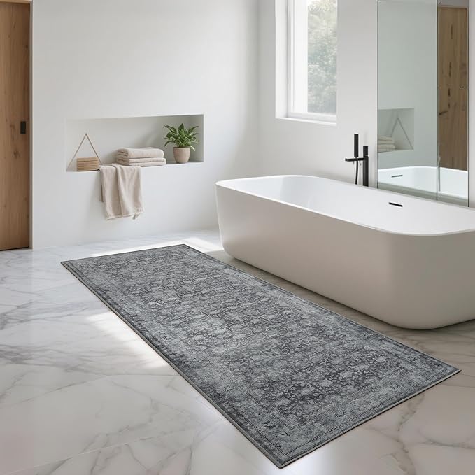 2'6"x8' Washable Runner Rug for Hallway, Non Slip Vintage Floral Long Carpet Runners for Entryway, Kitchen, Bathroom, Bedroom, Low Pile Laundry Rugs with Rubber Backing (Distressed Grey)