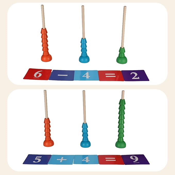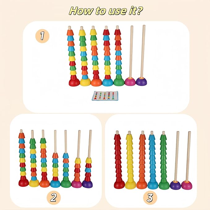 - Fine movements: Children need to accurately put rings of different colors and sizes on the pillars to exercise fine hand movements and hand-eye coordination.