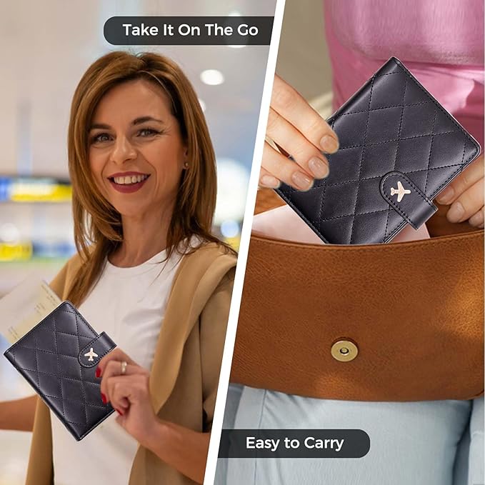 - 【Snap Button Closure and Security Protective】The passport holder with the hidden magnetic snap button closure design, which is safe and reliable to protect your travel items from being lost,to provide dual protection.Besides,RFID blocking shield material inside, Our passport case has a material engineered specifically to block 13.56 MHz or higher RFID signals and protect our important private information stored on your passport and credit cards from unauthorized scans.