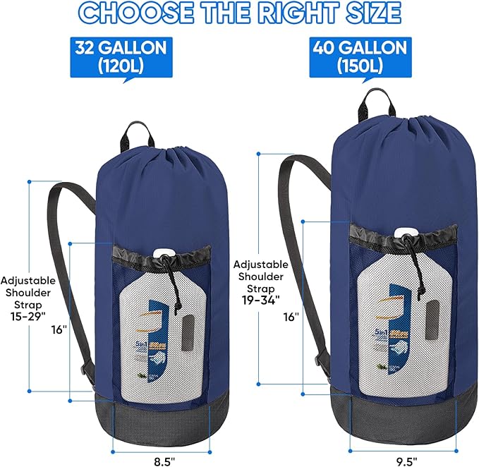 - 150L Large Laundry Bag: These travel laundry bags measure 32 "H X 16 "L with a large capacity of up to 150 L, enough for holding 2-3 batches of clothes; They also feature two front mesh wash pockets (16 "H X 8.5"L each), making your laundry backpack have space for storing detergent, shoes, and other essentials