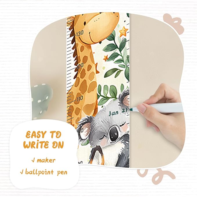 - Design: Kids growth chart with rope at the top of the chart, easy to install and removeable, foldable and portable design, easy to store, hang, roll up, transport, and save space. It boasts a material that's easy to write on, where you can use dark colored ballpoint pens and markers to track growth milestones. Our height ruler can clearly show your kids' height.