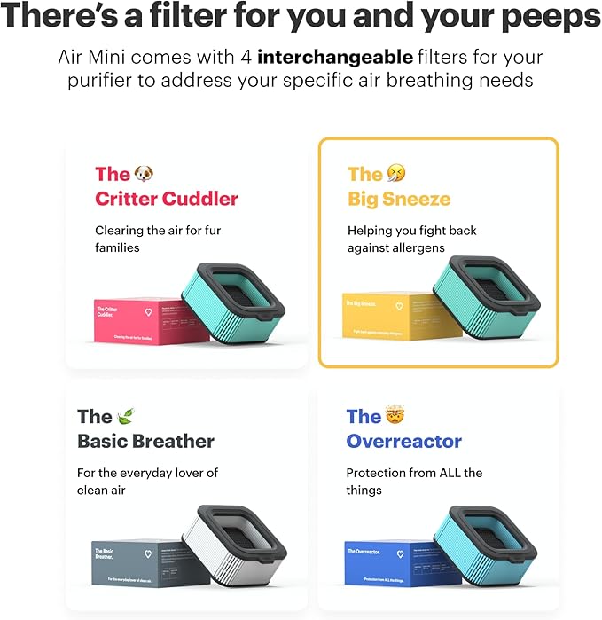 - 4 FILTERS: Switch between 4 filters based on seasonality or life events, with certified HEPA filtering for particle removal (smoke, allergens, house dust). Big Sneeze has 99.97% efficiency, and works well in different-sized rooms, but ideal for 741ft².