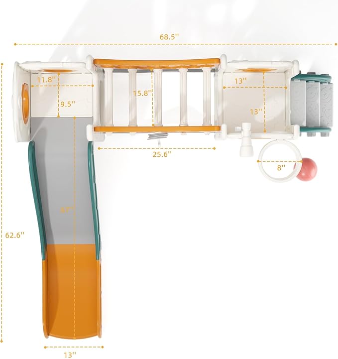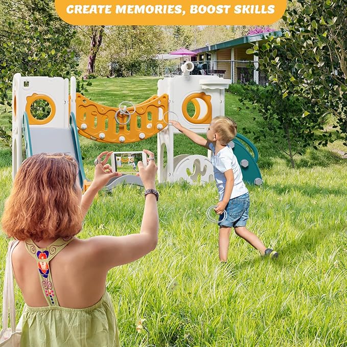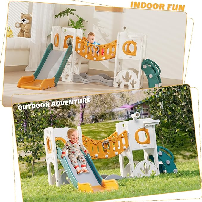 - 10-in-1 Play Features: Combines climbing bridge, slide, basketball hoop, hide-and-seek hole, play telescope, golf set, ring toss, climber stair, wavy bottom and storage – fostering active play and creativity.