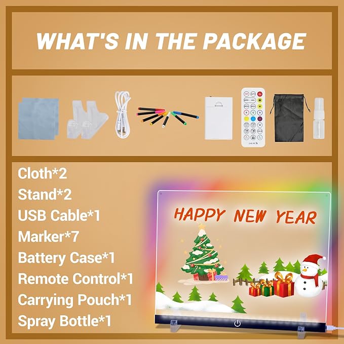 - LED Message Board with Effortless Display and Immediate Use: Setting up your Wooshneesham Acrylic Board is as easy as placing it on the provided stand or using the hanging rope to mount it on a wall. The 7 included markers let you start writing, drawing, and experimenting right away—no need for extra trips to the store. A user-friendly design ensures you can switch between functions such as doodling, illuminating, or showcasing messages in seconds.