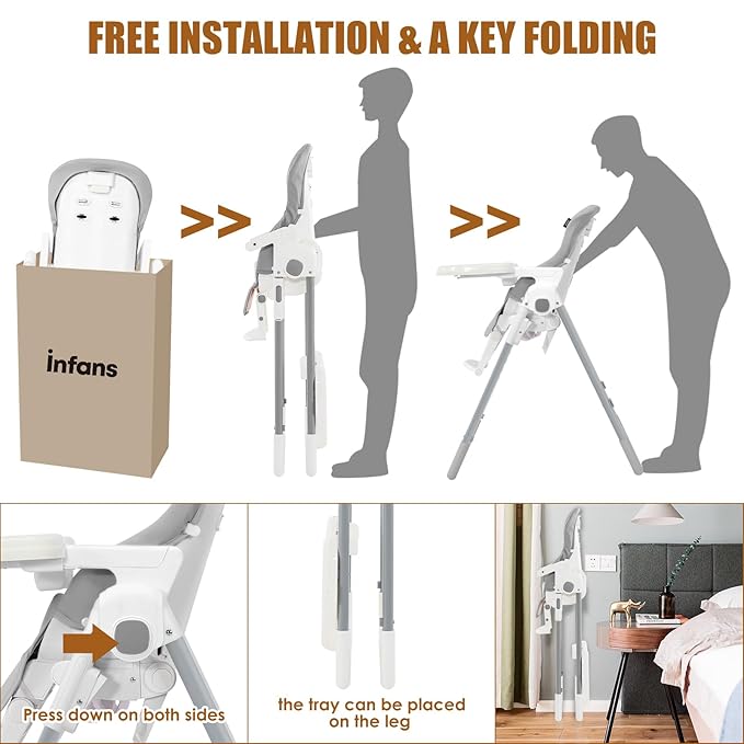 - 😋FREE INSTALLATION WITH FOLDABLE STRUCTURE: How to storage things are often be the daily trouble for the families which have babies. Our high chair have scientific frame to fold for easily storage. The detachable trays also can be fixed on the legs for space saving. The highchair can stand freely after fold without additional support. No installation required is ideal for convenient use to save time and energy. There are two built-in rear wheels, mobile more convenient.