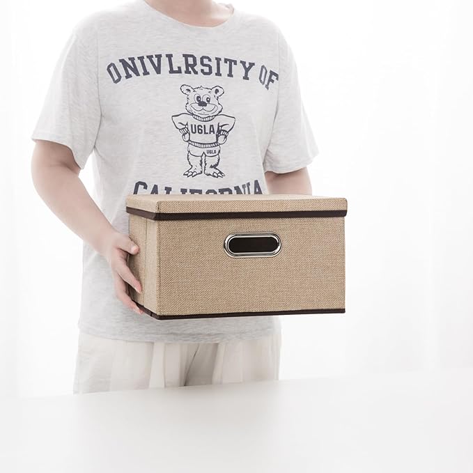 PRANDOM Storage Bins with Lids [3-Pack] Jute Fabric Foldable Storage Boxes Organizer Containers Baskets Cube with Cover for Home Bedroom Closet Office Nursery khaki(11.4X8.6X6.7