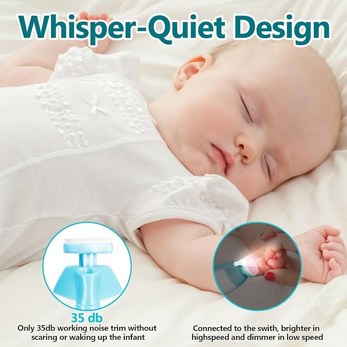 - Low Noise – The Baby electric nail trimmer is equipped with a whisper-quiet design. Only 35dB operating sound. You can file nails even as the baby sleeps, without causing any disturbance. You can use it in the dark at night.