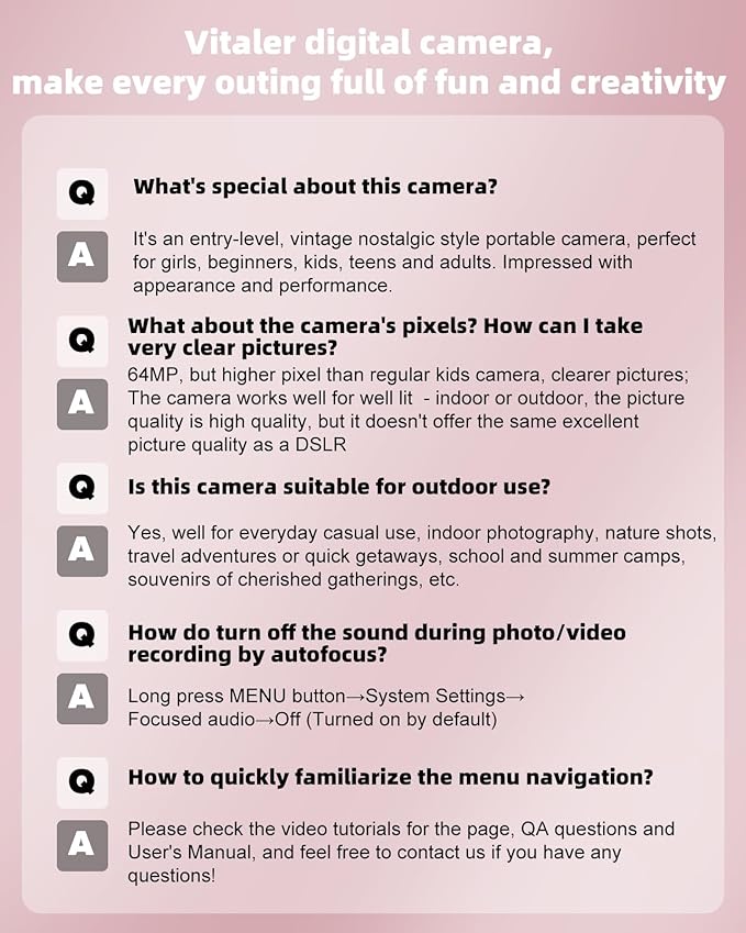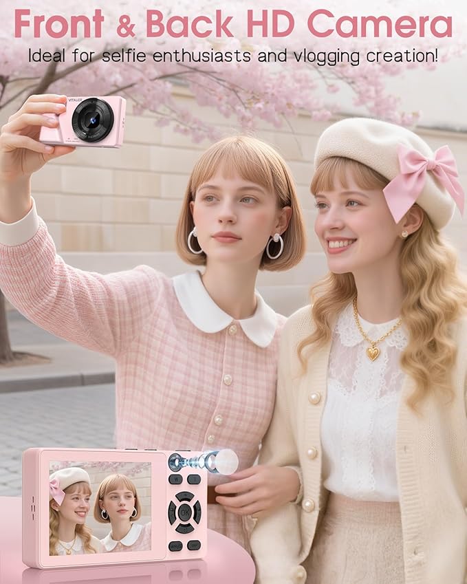 - 2000mAh Large Battery & Metal Shell: Vitaler digital camera is designed with a built-in battery that extends the shooting time dramatically, no need to replace the spare battery. Equipped with Type-C port, supports charging by power bank and you don't have to worry about missing out on beautiful moments when you're traveling. The camara digital shell features a high-quality zinc alloy (not cheap plastic), delivering exceptional strength and durability to withstand drops.