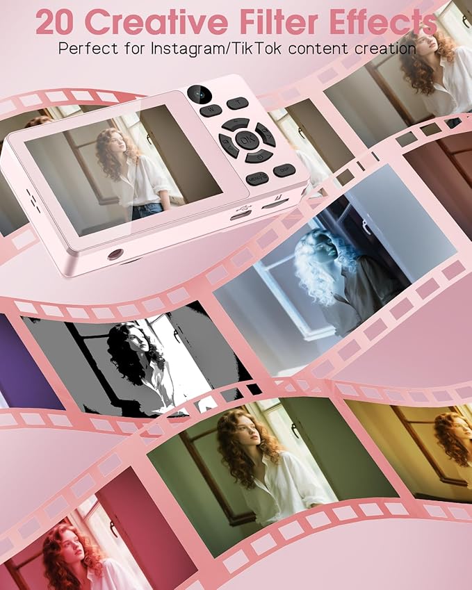 - Shoot Storytelling Images With Ease: This camera's portrait effect is professionally turned and focuses on portrait and close-up photography, perfect for shooting vintage atmosphere, “French oil painting” style photos in bright scenes, and easy to create popular socal media photos and videos without any retouching.20 filter styles, fill light, more fun and creativity waiting for you to explore!