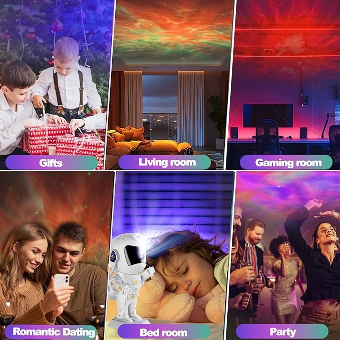 - 🚀【Nebula Effects】The astronaut projector designed with 8 kinds of amazing nebula effects and with twinkling green stars. Projecting on the walls or ceiling of the bedroom to create a tranquil and immersive galaxy atmosphere