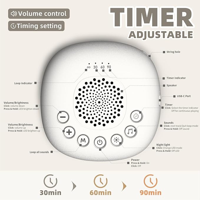 - Adjustable brightness & Timer: Our portable noise machine with 30, 60, 90 minutes auto-off timers or continuous play base on needed, you can adjust a comfortable volume of sleep sounds and set a right LED intensity for sleeping therapy.
