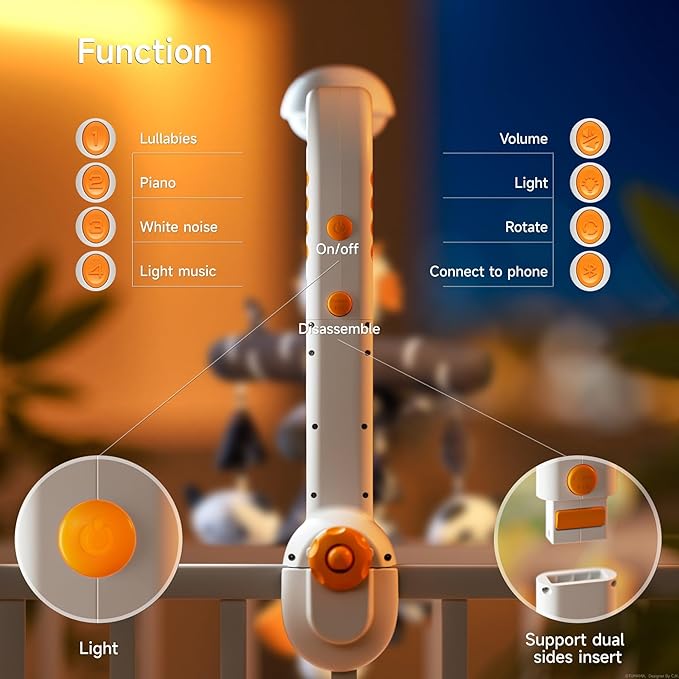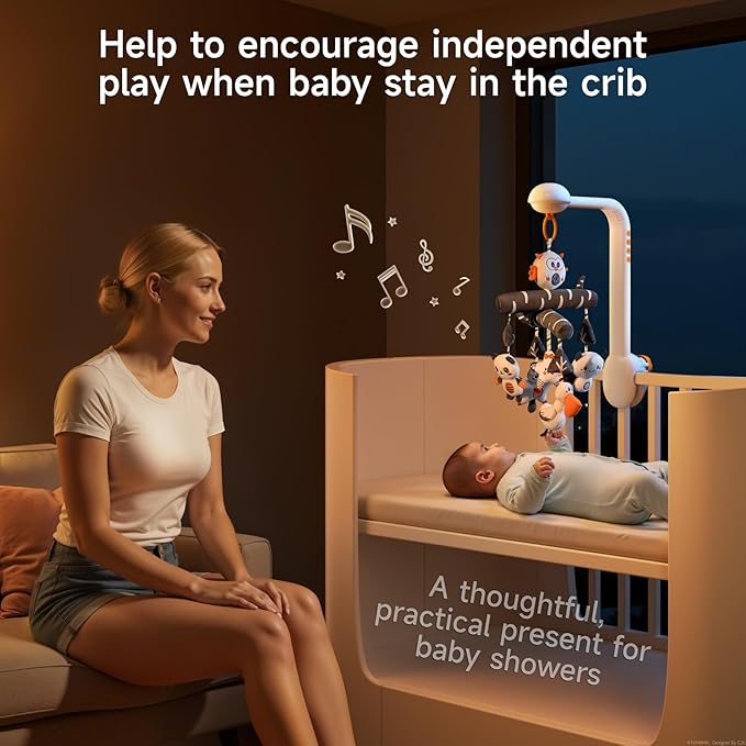 - Multi-purpose and Easy to Assemble: The baby mobile is equipped with a unique non-slip knob, which can be easily attached to any crib less than 1.5 inches, and equipped with sturdy guide rails and spindles. It is perfect for indoor and outdoor use and easy to move, such as crib, bassinet, playard, swing, stroller, changing table, stroller and bed, play mat, playroom, car seat...