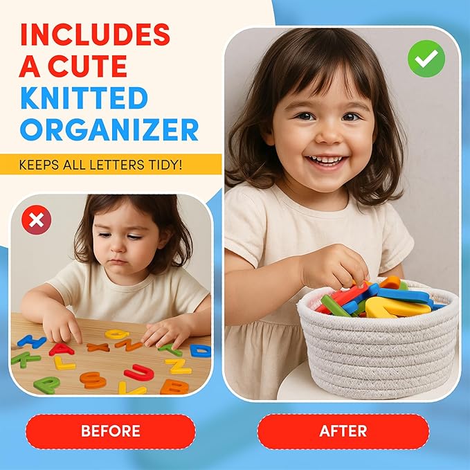 - Great Learning Partner: Encourage 4-in-1 early development: Letter recognition, spelling practice, color sorting, and coordination skills! Children learn ABCs through tactile play โ building words on the fridge or sorting colors. Vibrant hues accelerate color learning, ideal for interactive sessions with refrigerators and whiteboards