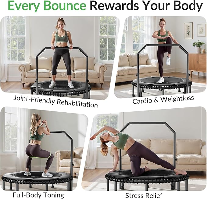 - 4-level Adjustable Handle: The fitness trampoline equipment with a 4-level height adjustable handlebar raged from 2'6" to 3'5" (on the mat), Jump with confidence