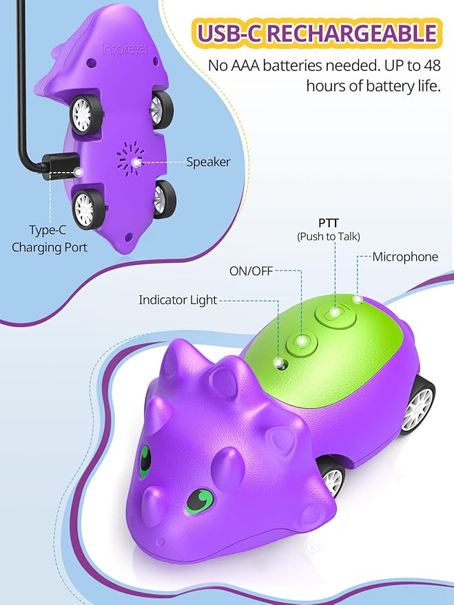 - [Rechargeable, Long-Lasting] : No more wasting money on endless AAA batteries! Each dino walkie-talkie toy car charges easily with the included USB-C cable and lasts up to 48 hours on a single charge, keeping the dino adventures going anytime, anywhere. Please Note: The included cables are designed for these dinosaur toys only and should not be replaced with other cords.