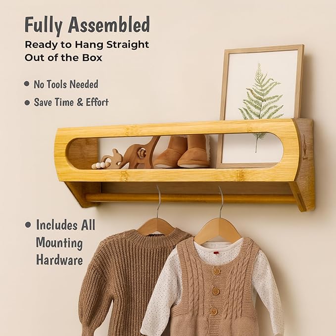- Special Feature : Built-In Hanger Rod, Front Safety Lip, No Assembly Required, Rounded Corners, Solid Bamboo Construction Built-In Hanger Rod, Front Safety Lip, No Assembly Required, Rounded Corners, Solid Bamboo Construction