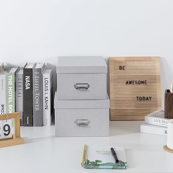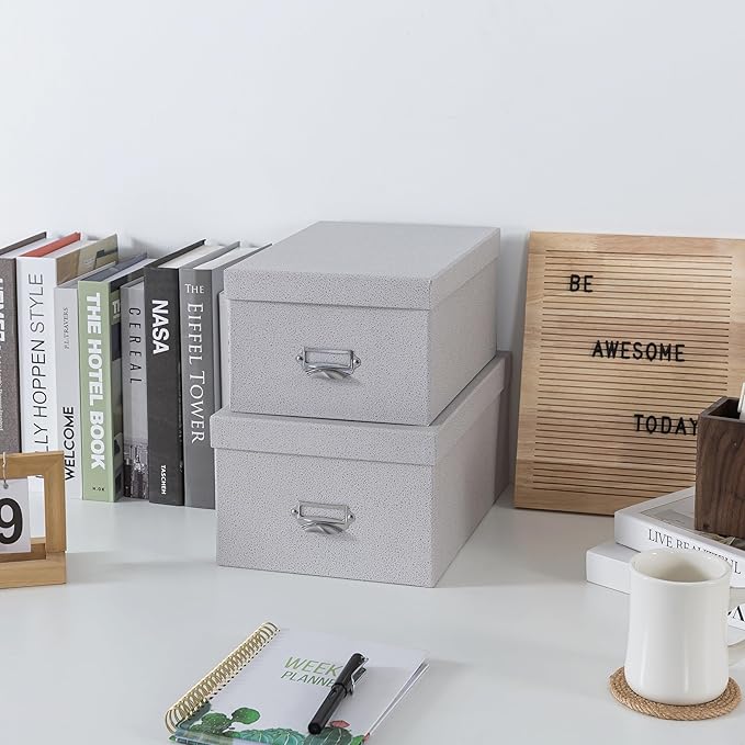 - PREMIUM KEEPSAKE STORAGE BOX: Each decorative storage box is crafted from durable paperboard with a textured finish. The subtle gray color complements any décor while the metal hardware adds vintage charm to these keepsake box organizers.