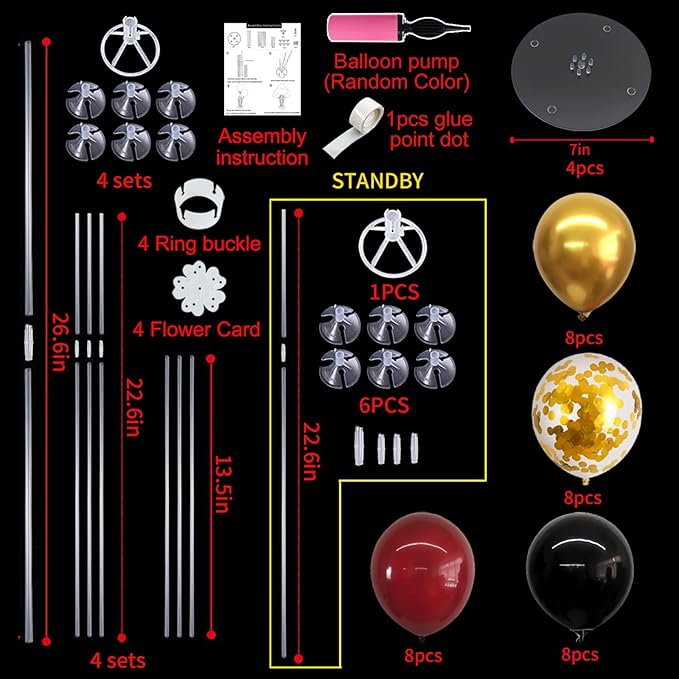 - Included Components : Balloon Stand, Filling Pump, Glue, Red Black Gold Balloons, Tying Tool