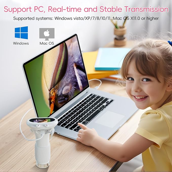- PC Connection & fun sharing: The USB digital microscope can be connected to a computer via the included USB cable for large-screen real-time viewing, supporting Windows Vista/XP/7/8/10/11, MacOS X 11.0 or later; or save and share kids' explorations and discoveries with family and friends.