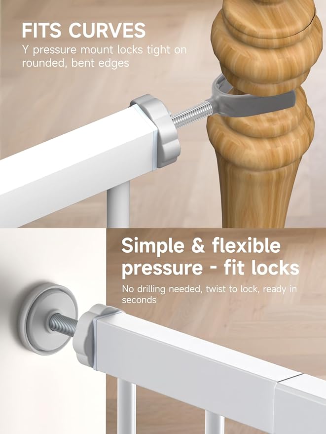 - Double Safety with a Double-Lock Design: The child gate is equipped with double lock design. This double lock mode makes it difficult for toddlers to open the gate, Sturdy safety gate to keep your baby out of the top of the stairs, laundry room or kitchen, and keep your dogs out of the main living area. Perfect for children aged 6-36 months and great for dogs as well