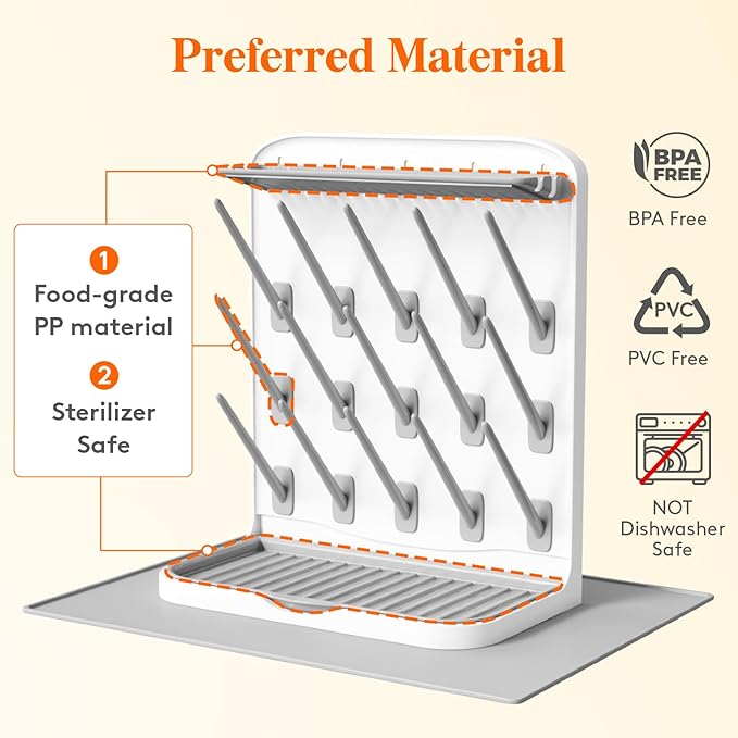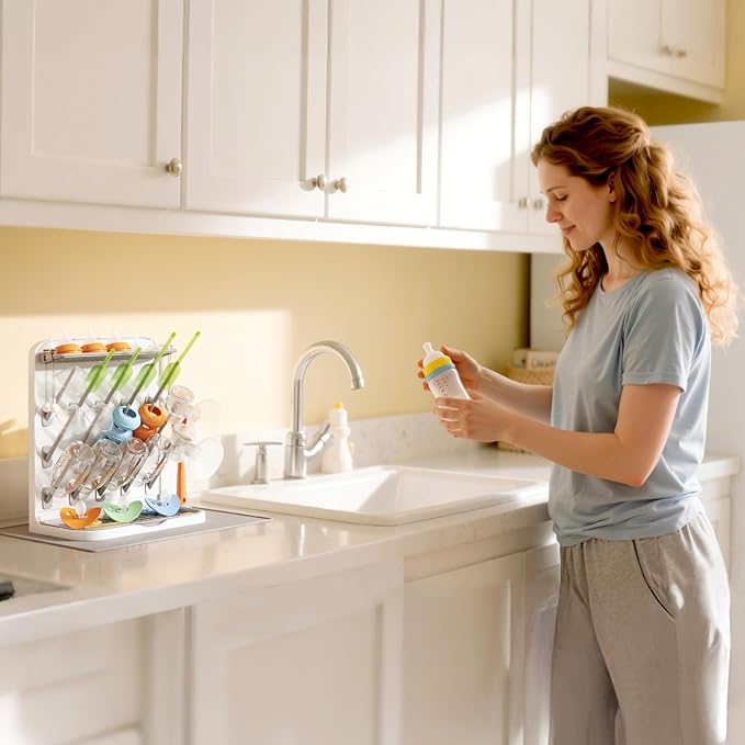 - All-in-One Baby Bottle Drying Rack: This drying rack features 15 pegs that accommodate 4-5 sets of bottles of all sizes and accessories, including nipples, straws, pacifiers, valves, lids and breast pump parts, offering a space-saving storage solution