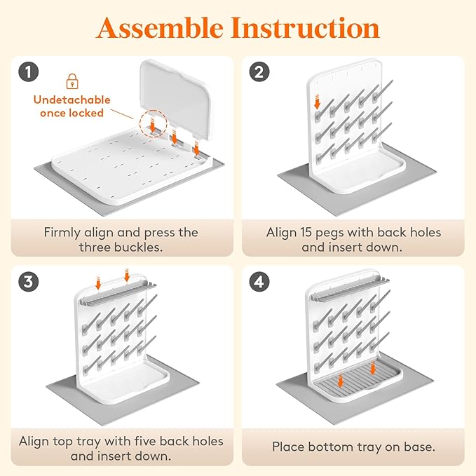 - Detachable Design: The top pacifier tray, bottom drain tray, and 15 pegs are removable. The pacifier tray holds up to 5 pacifiers and features holes on two sides for gravity balls. The drain tray collects water droplets and store bottle caps and brushes