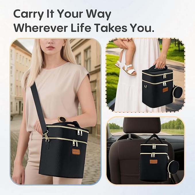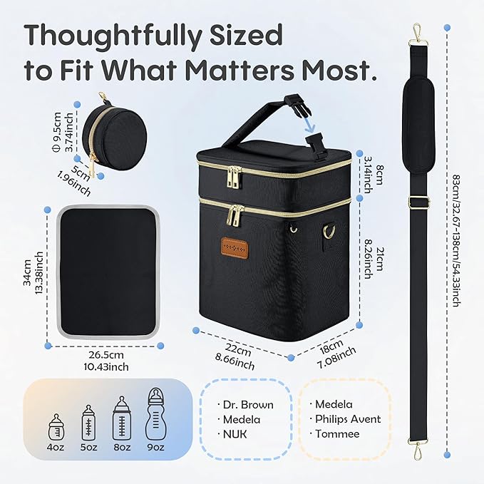 - 1️⃣ Large Capacity for Pumping Moms Holds up to 6 standard 9oz bottles in the bottom compartment. The top layer stores wearable pumps, snacks, or accessories—perfect for daily use or long outings