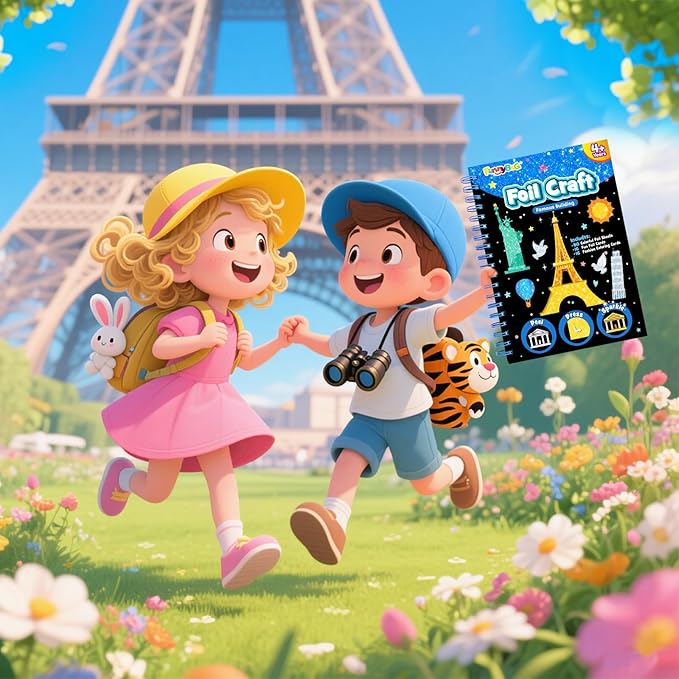 - 👸Easy-to-Use Foil Art Craft Kit : This foil art crafts kit includes 80 colored foil paper, 16 foil cards, one 8--color crayon and 16 coloring cards– an ideal filler for toddlers & kids! No glue, no mess, just peel & press to create: Eiffel Tower,Statue of Liberty,Sydney Opera House,Pyramids of Giza,Tower Bridge,Red Square,The White House and more interesting world-famous buildings designs.Let Kids know and observe the world by learning about famous buildings,Keep boys and girls engaged during crafts and classroom creative activities or travel kids activity
