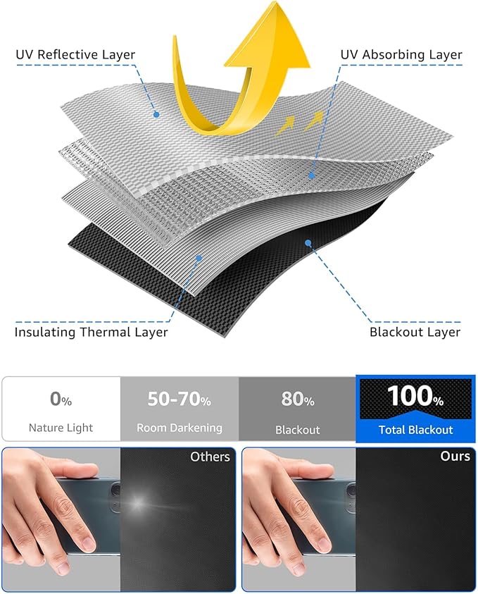 - đă100% BlackoutăSumobaby blackout curtains adopts upgraded reflective silver coating and high-density black polyester, the blackout effect can easily reach 100%. Blocks sunlight and harmful UV rays to darken your room, thermal insulated and enhance privacy.