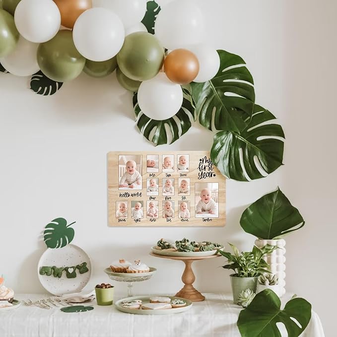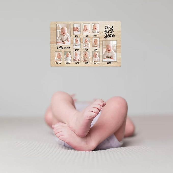 - CUTE KEEPSAKE FRAME --- This beautiful photo board features an engraved pattern. The adorable baby keepsake frame documents and displays your baby girl or baby boy's first-year monthly growth. It also becomes a gorgeous keepsake after the party.