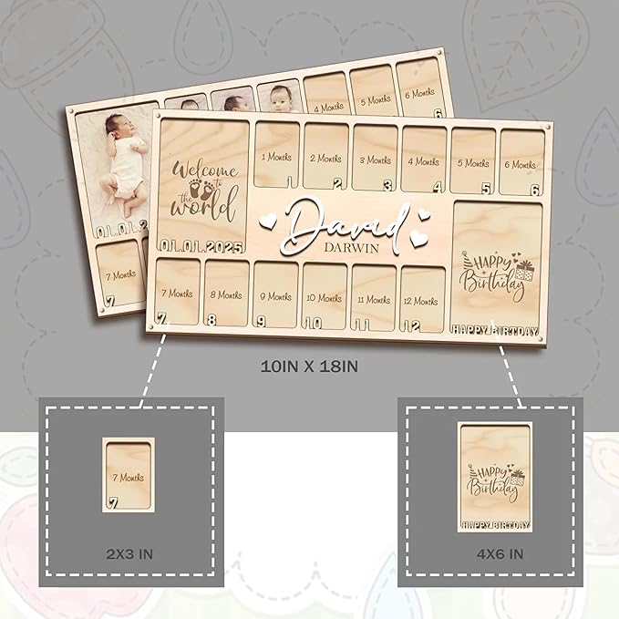 - Our baby's first year picture frame preserves your photographs, cards, and cherished memories with a clear view. This 12 Month babys first year is ideal for showcasing one year of baby photo board, Whether you need a first birthday photo board or a first year frame, this frame is ideal for displaying your baby's monthly photos. A wonderful baby keepsake frame, it serves as a memorable keepsake for your baby's first year, making it an essential part of your first year photo board.