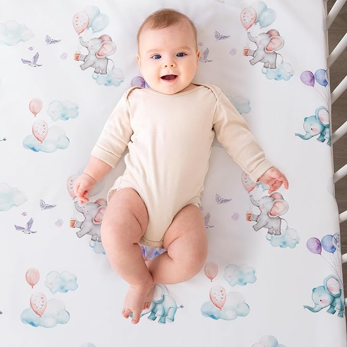 - Soft Crib Sheet: The fitted crib sheet design is 28 x 52 inches and 8 inches deep pocket can perfectly fit the standard crib mattresses. There are small cartoon prints of the same theme as the quilt on it. Equipped with elastic bands that can snugly wrap around the crib mattress, not loose, but flat, keep the crib sheet in place when baby roll or crawl on the mattress. Easy to put on and off for changing and washing. Simple to use but comfortable and cozy enough for daily baby care.