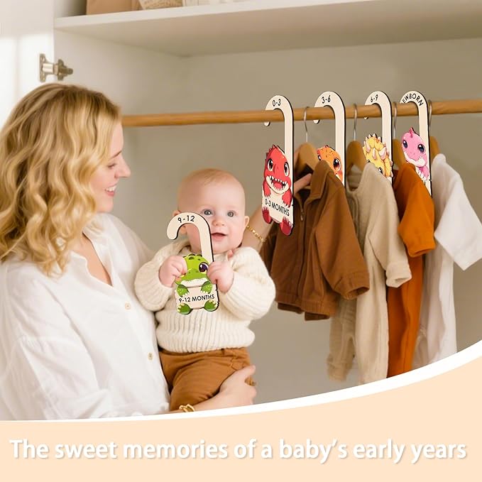 - 【What's Included】 This set of wooden baby closet organizers includes 8 sturdy dividers, each featuring a different dinosaur illustration. They cover essential growth stages: newborns, 0-3 months, 3-6 months, 6-9 months, 9-12 months, 12-18 months, 18-24 months, and toddler. As your baby grows, sorting clothes by age makes daily access and care much smoother
