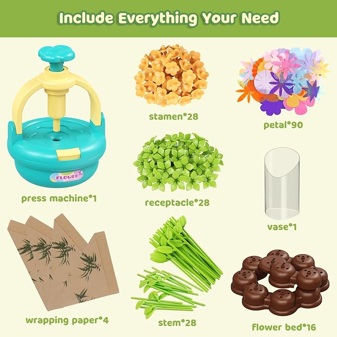 - All in One Kits:This flowers market crafts toy includes press machine,flower bed,receptacles,stem,stamens,vase,flower wrapping paper,petals.The base of the flower press is detachable and can be used for storage.The rich accessories allow children to freely unleash their imagination and embark on a creative floral art journey