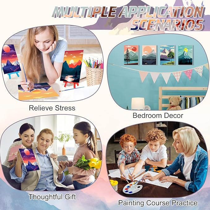 - 10 Pre Printed Canvases: 10 kinds of sunset patterns are engraved on the pre drawn board; Include sun, mountains and other patterns, the size of: 7 x 5 x 0.1inch/18 x 13 x 0.3cm, cute and easy, you can use the provided paint to color according to your own aesthetics, improve your painting creativity in the process, and also reduce stress and relieve anxiety