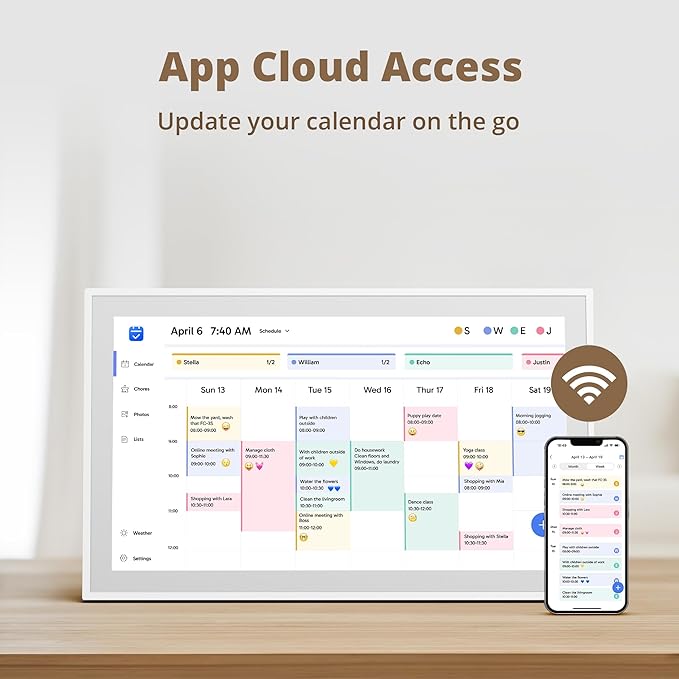 - 【Easy Setup and Auto-Sync】: Enjoy a user-friendly design that our smart picture frame allows for quick setup—just plug in, connect to Wi-Fi, and link your calendar to the Mobile App. Once synced, it seamlessly integrates multiple personal calendars (iOS, Google, etc.) into one unified interface. Authorize additional devices for even greater convenience.
