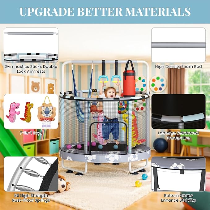 - ✨【360° Safety You Can Trust】Features a high-density enclosure net, anti-slip base pads, and 36 reinforced springs for maximum safety and support. ASTM-certified, giving parents peace of mind while kids play confidently.