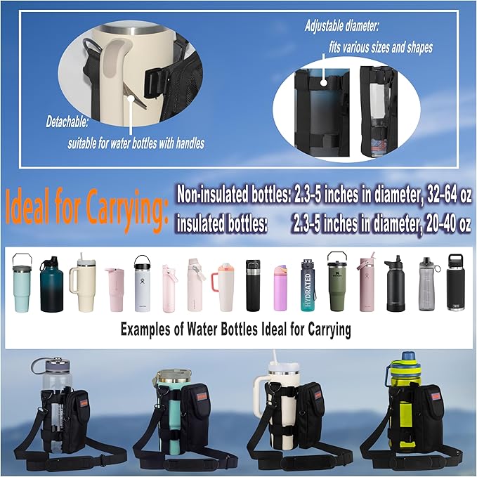 - Adjustable Fit & Wide Compatibility – The water bottle bag adjusts and locks securely to Fits most standard water bottles on the market: works for non-insulated bottles (2.3–5 inches in diameter, 32–64 oz) and insulated bottles (2.3–5 inches in diameter, 20–40 oz)